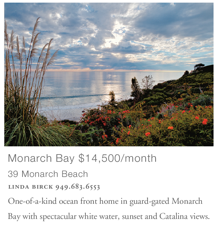 Monarch Bay $14,500/month 39 Monarch Beach linda birck 949.683.6553 One-of-a-kind ocean front home in guard-gated Monarch Bay with spectacular white water, sunset and Catalina views.