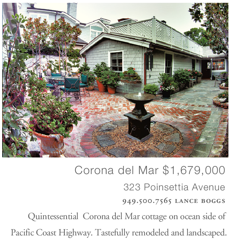 Corona del Mar $1,679,000 323 Poinsettia Avenue 949.500.7565 lance boggs Quintessential Corona del Mar cottage on ocean side of Pacific Coast Highway. Tastefully remodeled and landscaped.