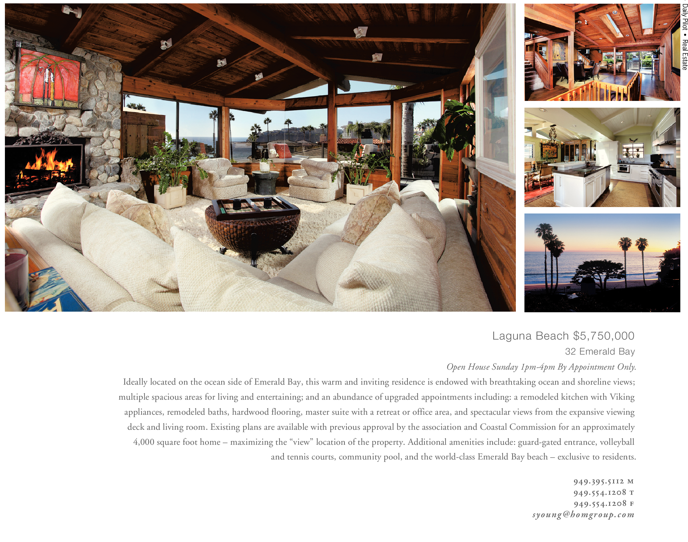 Laguna Beach $5,750,000 32 Emerald Bay Open House Sunday 1pm-4pm By Appointment Only. Ideally located on the ocean side of Emerald Bay, this warm and inviting residence is endowed with breathtaking ocean and shoreline views; multiple spacious areas for living and entertaining; and an abundance of upgraded appointments including: a remodeled kitchen with Viking appliances, remodeled baths, hardwood flooring, master suite with a retreat or office area, and spectacular views from the expansive viewing deck and living room. Existing plans are available with previous approval by the association and Coastal Commission for an approximately 4,000 square foot home – maximizing the “view” location of the property. Additional amenities include: guard-gated entrance, volleyball and tennis courts, community pool, and the world-class Emerald Bay beach – exclusive to residents. 949.395.5112 m 949.554.1208 t 949.554.1208 f syoung@homgroup.com