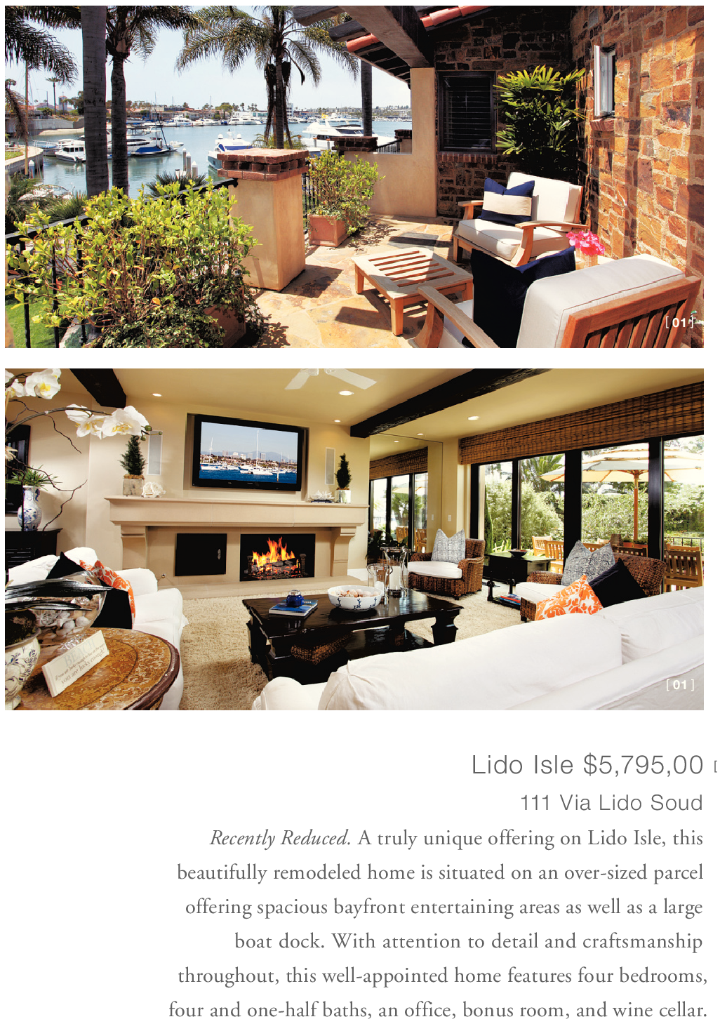[ 01 ] [ 01 ] Lido Isle $5,795,00 111 Via Lido Soud Recently Reduced. A truly unique offering on Lido Isle, this beautifully remodeled home is situated on an over-sized parcel offering spacious bayfront entertaining areas as well as a large boat dock. With attention to detail and craftsmanship throughout, this well-appointed home features four bedrooms, four and one-half baths, an office, bonus room, and wine cellar. [ See also