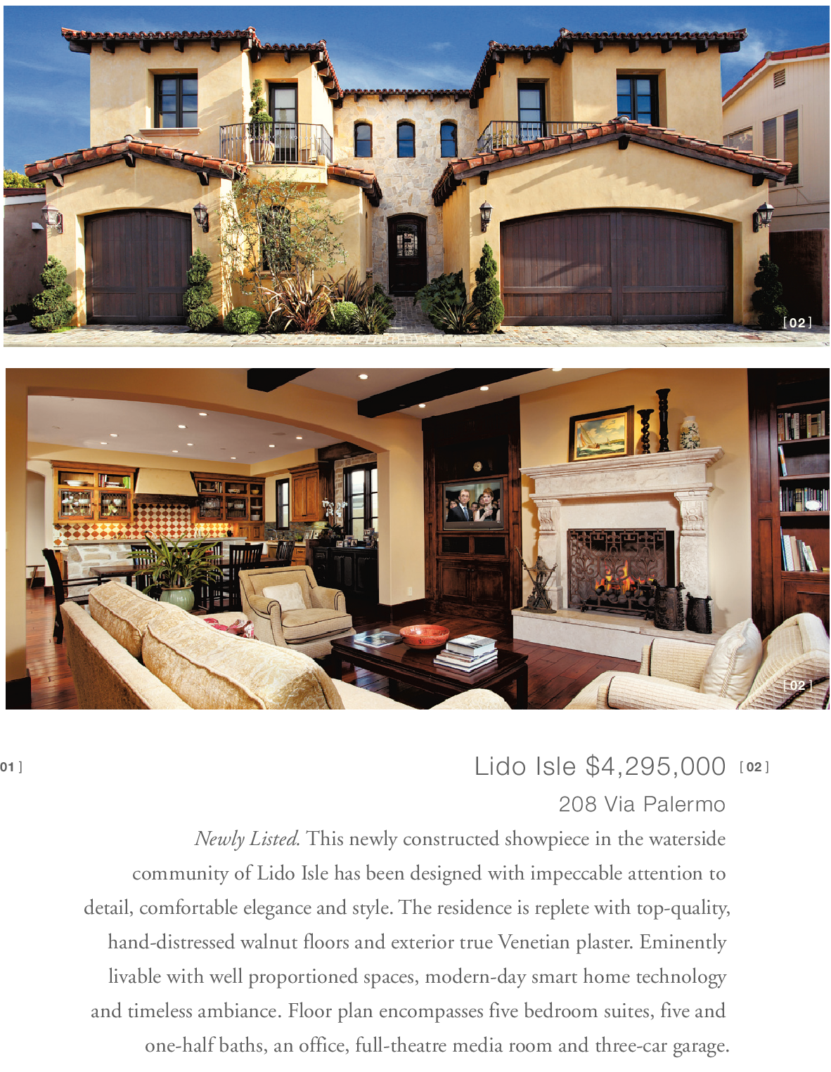 01 ] Lido Isle $4,295,000 208 Via Palermo Newly Listed. This newly constructed showpiece in the waterside community of Lido Isle has been designed with impeccable attention to detail, comfortable elegance and style. The residence is replete with top-quality, hand-distressed walnut floors and exterior true Venetian plaster. Eminently livable with well proportioned spaces, modern-day smart home technology and timeless ambiance. Floor plan encompasses five bedroom suites, five and one-half baths, an office, full-theatre media room and three-car garage. [ 02 ] [ 02 ] [ 02 ]
