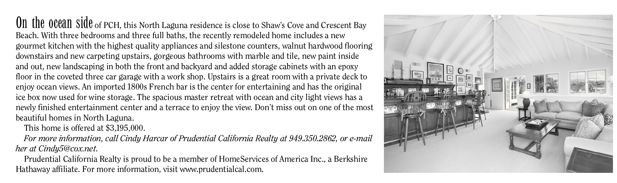 On the ocean side of PCH, this North Laguna residence is close to Shaw’s Cove and Crescent Bay Beach. With three bedrooms and three full baths, the recently remodeled home includes a new gourmet kitchen with the highest quality appliances and silestone counters, walnut hardwood flooring downstairs and new carpeting upstairs, gorgeous bathrooms with marble and tile, new paint inside and out, new landscaping in both the front and backyard and added storage cabinets with an epoxy floor in the coveted three car garage with a work shop. Upstairs is a great room with a private deck to enjoy ocean views. An imported 1800s French bar is the center for entertaining and has the original ice box now used for wine storage. The spacious master retreat with ocean and city light views has a newly finished entertainment center and a terrace to enjoy the view. Don’t miss out on one of the most beautiful homes in North Laguna. This home is offered at $3,195,000. For more information, call Cindy Harcar of Prudential California Realty at 949.350.2862, or e-mail her at Cindy5@cox.net. Prudential California Realty is proud to be a member of HomeServices of America Inc., a Berkshire Hathaway affiliate. For more information, visit www.prudentialcal.com.