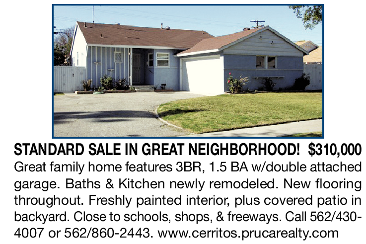 STANDARD SALE IN GREAT NEIGHBORHOOD! $310,000 Great family home features 3BR, 1.5 BA w/double attached garage. Baths & Kitchen newly remodeled. New flooring throughout. Freshly painted interior, plus covered patio in backyard. Close to schools, shops, & freeways. Call 562/430- 4007 or 562/860-2443. www.cerritos.prucarealty.com