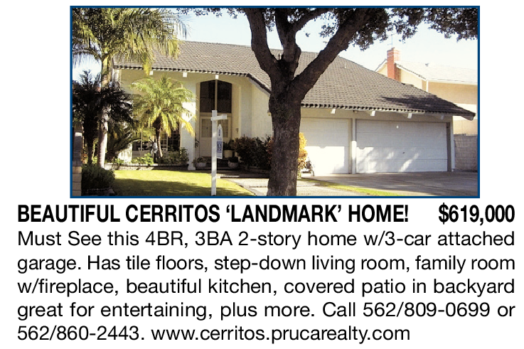 BEAUTIFUL CERRITOS ‘LANDMARK’ HOME! $619,000 Must See this 4BR, 3BA 2-story home w/3-car attached garage. Has tile floors, step-down living room, family room w/fireplace, beautiful kitchen, covered patio in backyard great for entertaining, plus more. Call 562/809-0699 or 562/860-2443. www.cerritos.prucarealty.com
