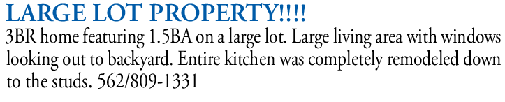 LARGE LOT PROPERTY!!!! 3BR home featuring 1.5BA on a large lot. Large living area with windows looking out to backyard. Entire kitchen was completely remodeled down to the studs. 562/809-1331 EXCELLENT OPPORTUNITY!!!!