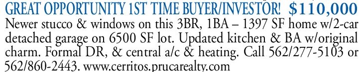 GREAT OPPORTUNITY 1ST TIME BUYER/INVESTOR! $110,000 Newer stucco & windows on this 3BR, 1BA – 1397 SF home w/2-car detached garage on 6500 SF lot. Updated kitchen & BA w/original charm. Formal DR, & central a/c & heating. Call 562/277-5103 or 562/860-2443. www.cerritos.prucarealty.com