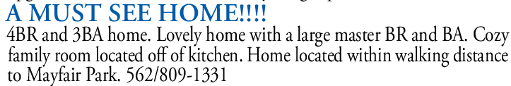 A MUST SEE HOME!!!! 4BR and 3BA home. Lovely home with a large master BR and BA. Cozy family room located off of kitchen. Home located within walking distance to Mayfair Park. 562/809-1331