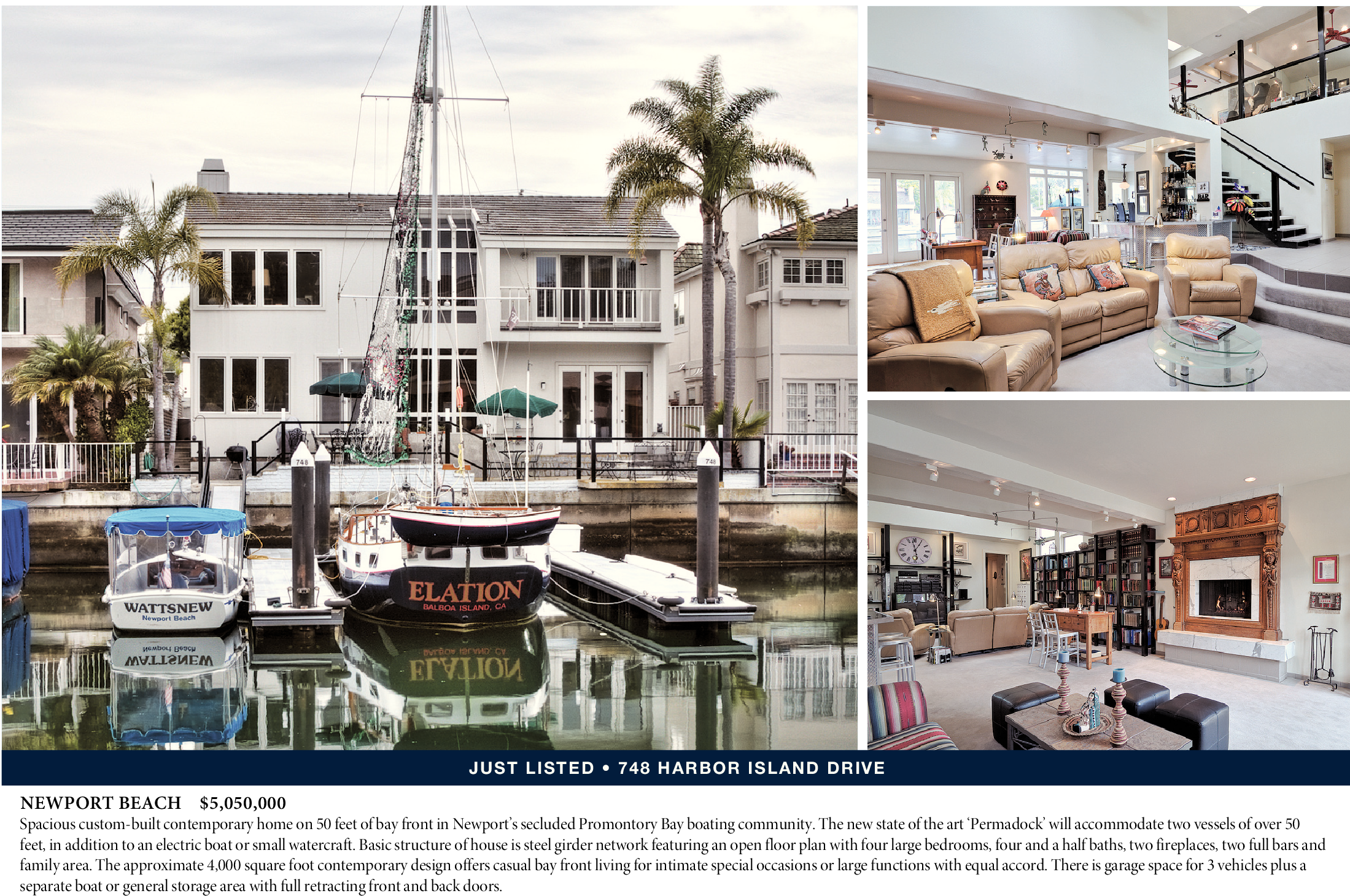 NEWPORT BEACH $5,050,000 Spacious custom-built contemporary home on 50 feet of bay front in Newport’s secluded Promontory Bay boating community. The new state of the art ‘Permadock’ will accommodate two vessels of over 50 feet, in addition to an electric boat or small watercraft. Basic structure of house is steel girder network featuring an open floor plan with four large bedrooms, four and a half baths, two fireplaces, two full bars and family area. The approximate 4,000 square foot contemporary design offers casual bay front living for intimate special occasions or large functions with equal accord. There is garage space for 3 vehicles plus a separate boat or general storage area with full retracting front and back doors.