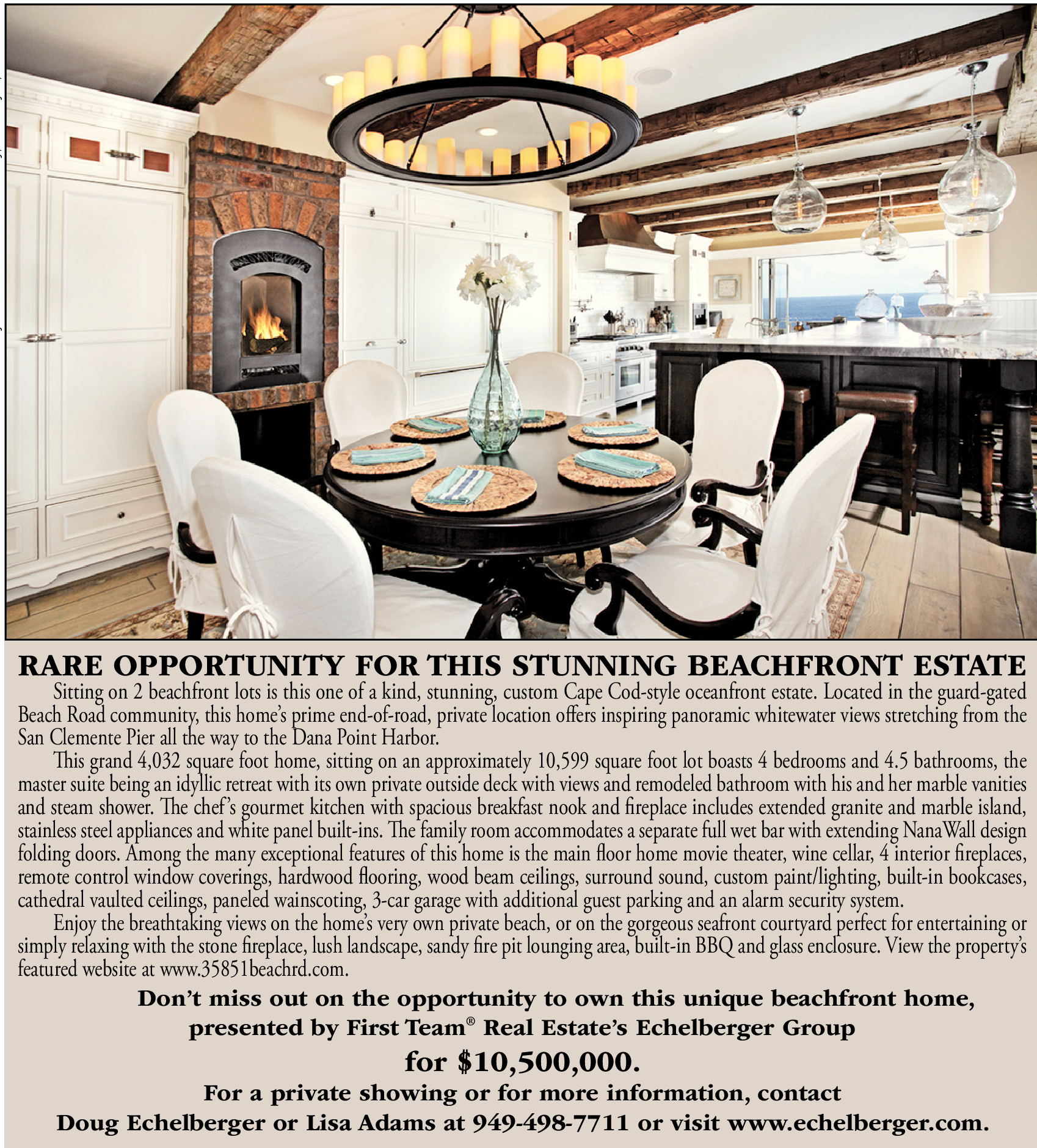 For a private showing or for more information, contact Doug Echelberger or Lisa Adams at 949-498-7711 or visit www.echelberger.com.
