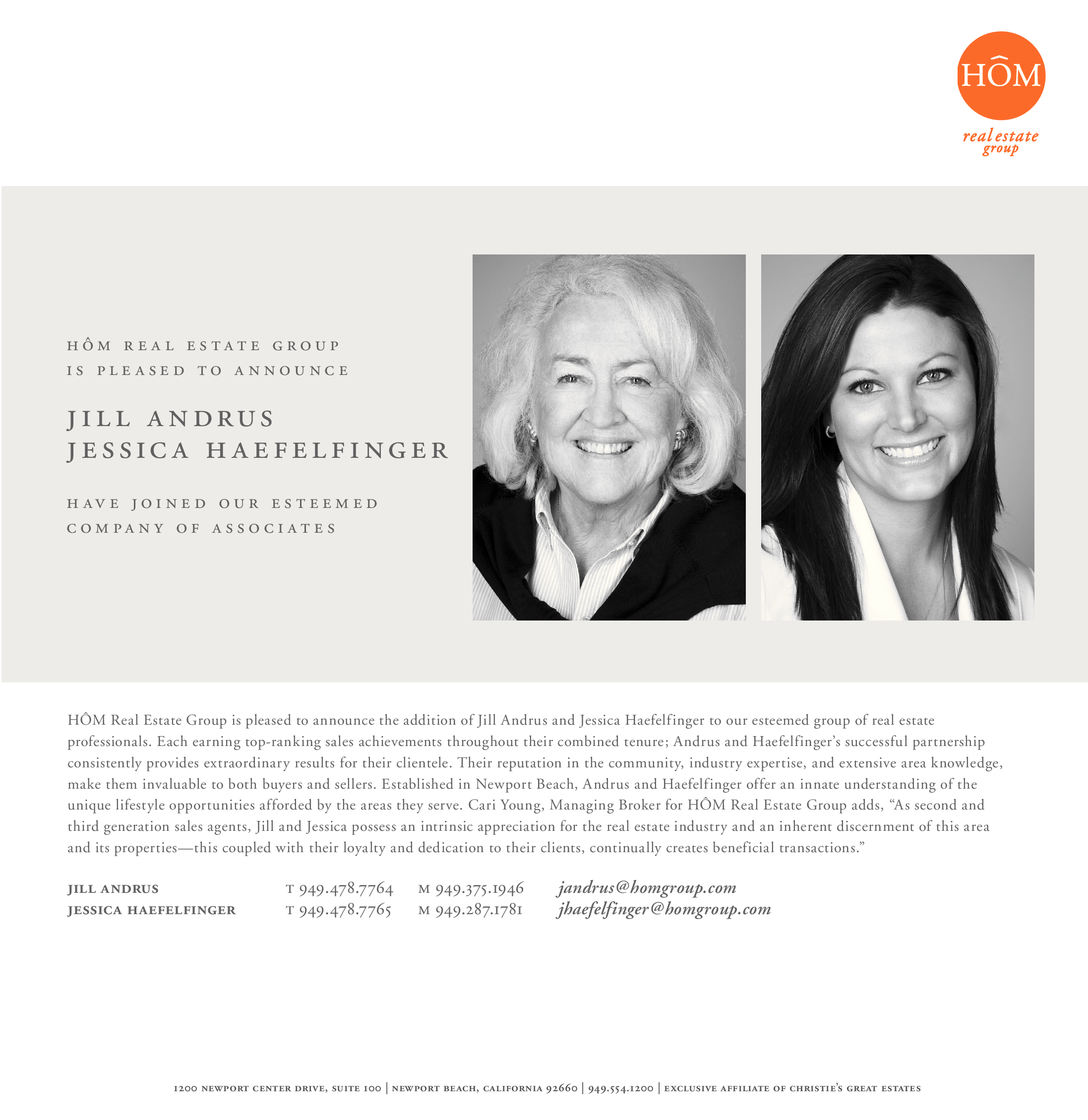 HÔM Real Estate Group is pleased to announce the addition of Jill Andrus and Jessica Haefelfinger to our esteemed group of real estate professionals. Each earning top-ranking sales achievements throughout their combined tenure; Andrus and Haefelfinger’s successful partnership consistently provides extraordinary results for their clientele. Their reputation in the community, industry expertise, and extensive area knowledge, make them invaluable to both buyers and sellers. Established in Newport Beach, Andrus and Haefelfinger offer an innate understanding of the unique lifestyle opportunities afforded by the areas they serve. Cari Young, Managing Broker for HÔM Real Estate Group adds, “As second and third generation sales agents, Jill and Jessica possess an intrinsic appreciation for the real estate industry and an inherent discernment of this area and its properties—this coupled with their loyalty and dedication to their clients, continually creates beneficial transactions.”