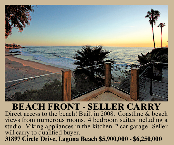 BEACH FRONT - SELLER CARRY Direct access to the beach! Built in 2008. Coastline & beach views from numerous rooms. 4 bedroom suites including a studio. Viking appliances in the kitchen. 2 car garage. Seller will carry to qualified buyer. 31897 Circle Drive, Laguna Beach $5,900,000 - $6,250,000