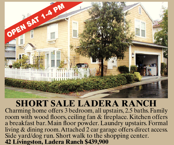SHORT SALE LADERA RANCH Charming home offers 3 bedroom, all upstairs, 2.5 baths. Family room with wood floors, ceiling fan & fireplace. Kitchen offers a breakfast bar. Main floor powder. Laundry upstairs. Formal living & dining room.Attached 2 car garage offers direct access. Side yard/dog run. Short walk to the shopping center. 42 Livingston, Ladera Ranch $439,900