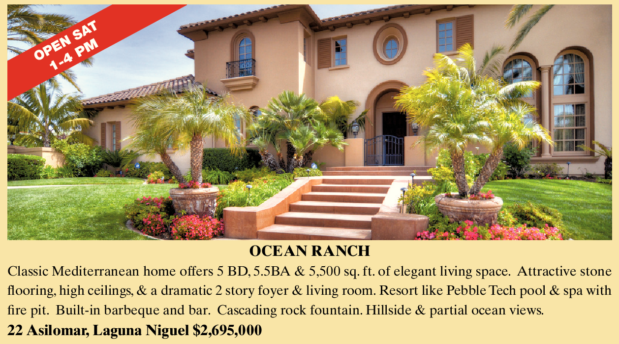 OCEAN RANCH Classic Mediterranean home offers 5 BD, 5.5BA & 5,500 sq. ft. of elegant living space. Attractive stone flooring, high ceilings, & a dramatic 2 story foyer & living room. Resort like Pebble Tech pool & spa with fire pit. Built-in barbeque and bar. Cascading rock fountain. Hillside & partial ocean views. 22 Asilomar, Laguna Niguel $2,695,000