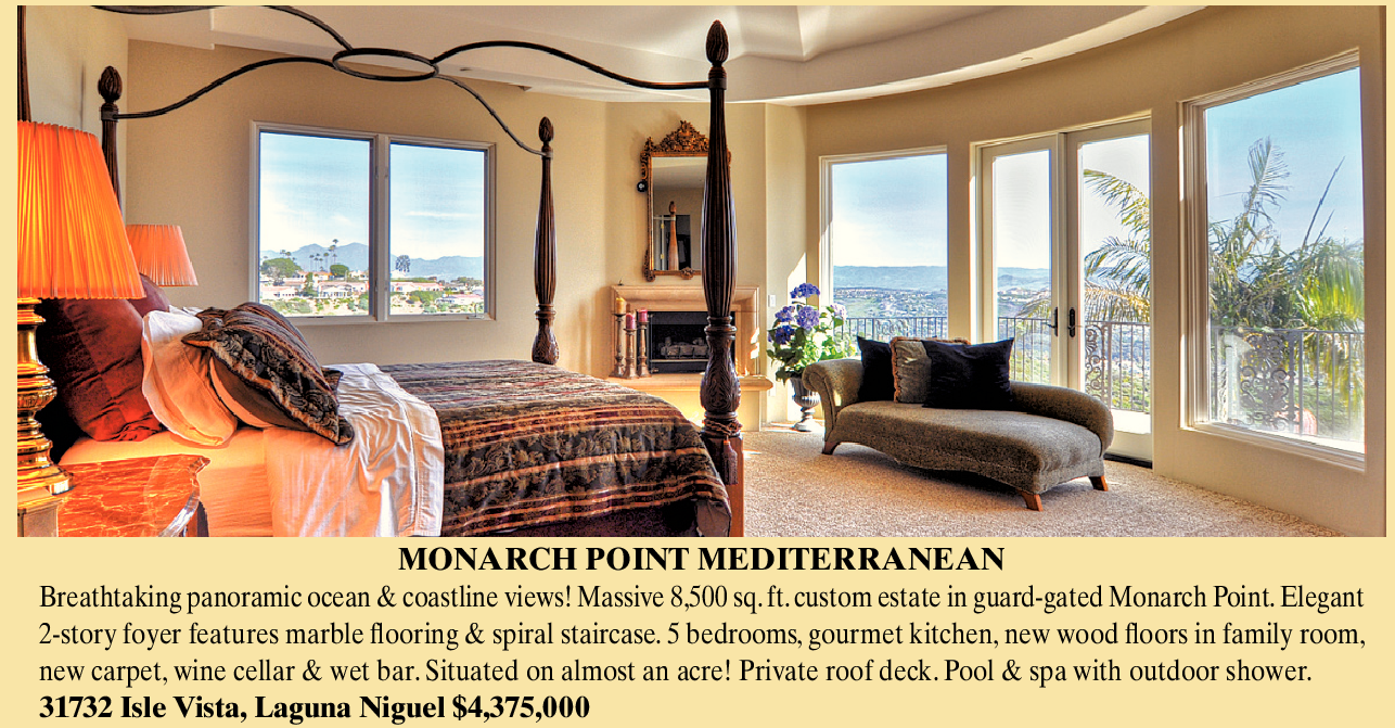 MONARCH POINT MEDITERRANEAN Breathtaking panoramic ocean & coastline views! Massive 8,500 sq. ft. custom estate in guard-gated Monarch Point. Elegant 2-story foyer features marble flooring & spiral staircase. 5 bedrooms, gourmet kitchen, new wood floors in family room, new carpet, wine cellar & wet bar. Situated on almost an acre! Private roof deck. Pool & spa with outdoor shower. 31732 Isle Vista, Laguna Niguel $4,375,000