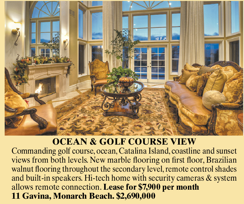 OCEAN & GOLF COURSE VIEW Commanding golf course, ocean, Catalina Island, coastline and sunset views from both levels. New marble flooring on first floor, Brazilian walnut flooring throughout the secondary level, remote control shades and built-in speakers. Hi-tech home with security cameras & system allows remote connection. Lease for $7,900 per month 11 Gavina, Monarch Beach. $2,690,000