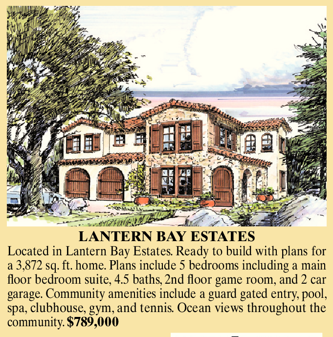LANTERN BAY ESTATES Located in Lantern Bay Estates. Ready to build with plans for a 3,872 sq. ft. home. Plans include 5 bedrooms including a main floor bedroom suite, 4.5 baths, 2nd floor game room, and 2 car garage. Community amenities include a guard gated entry, pool, spa, clubhouse, gym, and tennis. Ocean views throughout the community. $789,000