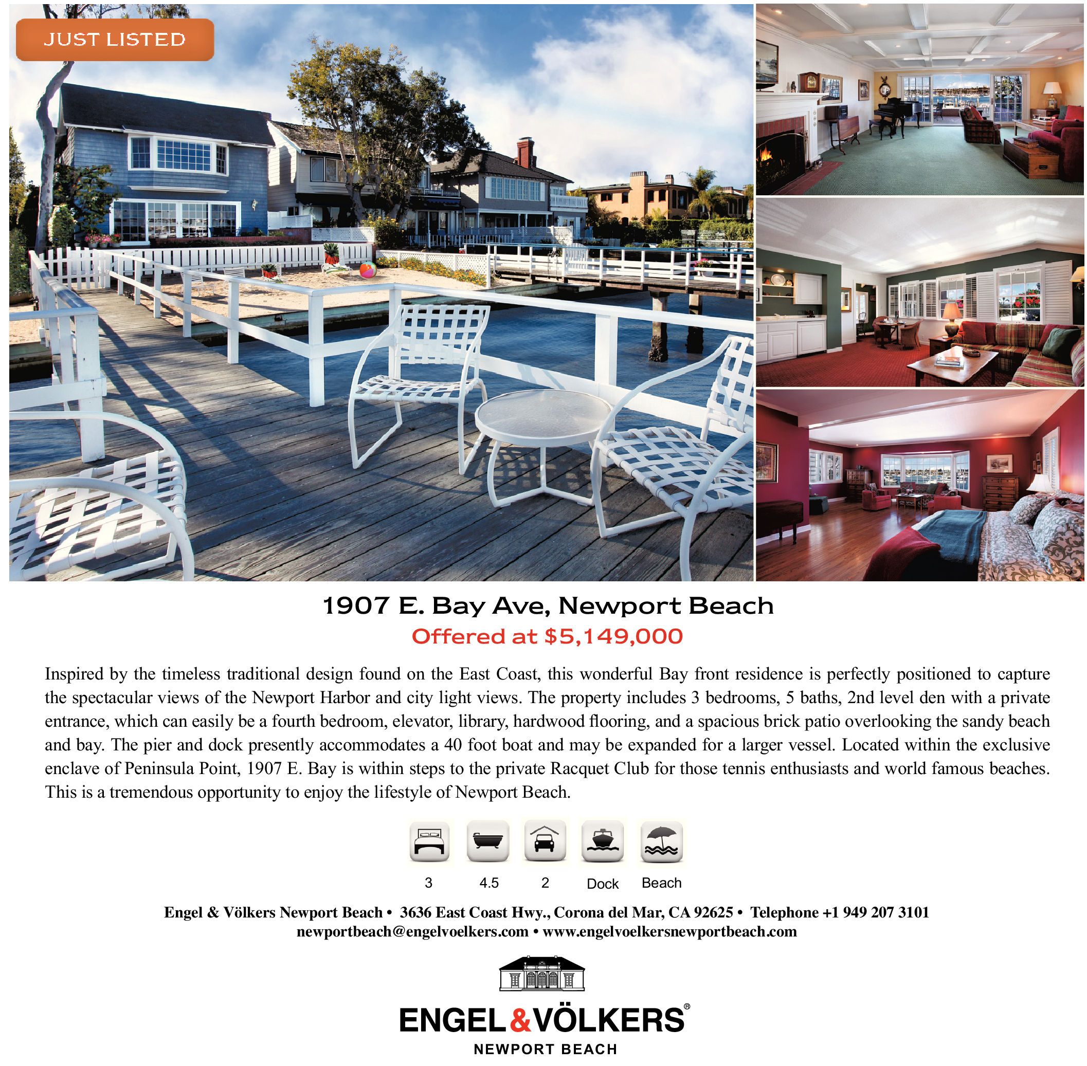 1907 E. Bay Ave, Newport Beach Offered at $5,149,000 Inspired by the timeless traditional design found on the East Coast, this wonderful Bay front residence is perfectly positioned to capture the spectacular views of the Newport Harbor and city light views. The property includes 3 bedrooms, 5 baths, 2nd level den with a private entrance, which can easily be a fourth bedroom, elevator, library, hardwood flooring, and a spacious brick patio overlooking the sandy beach and bay. The pier and dock presently accommodates a 40 foot boat and may be expanded for a larger vessel. Located within the exclusive enclave of Peninsula Point, 1907 E. Bay is within steps to the private Racquet Club for those tennis enthusiasts and world famous beaches. This is a tremendous opportunity to enjoy the lifestyle of Newport Beach. 3 4.5 2 Dock Beach Engel & Völkers Newport Beach • 3636 East Coast Hwy., Corona del Mar, CA 92625 • Telephone +1 949 207 3101 newportbeach@engelvoelkers.com • www.engelvoelkersnewportbeach.com NEWPORT BEACH
