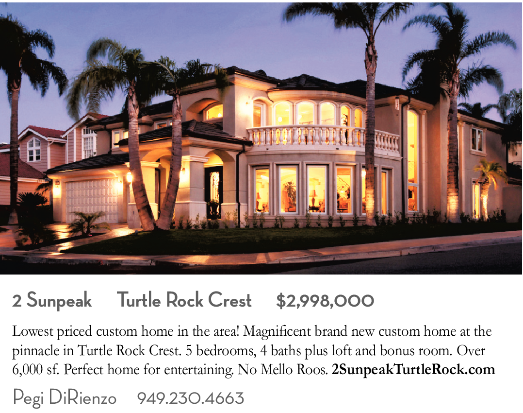 2 Sunpeak Turtle Rock Crest $2,998,000 Lowest priced custom home in the area! Magnificent brand new custom home at the pinnacle in Turtle Rock Crest. 5 bedrooms, 4 baths plus loft and bonus room. Over 6,000 sf. Perfect home for entertaining. No Mello Roos. 2SunpeakTurtleRock.com Pegi DiRienzo 949.230.4663