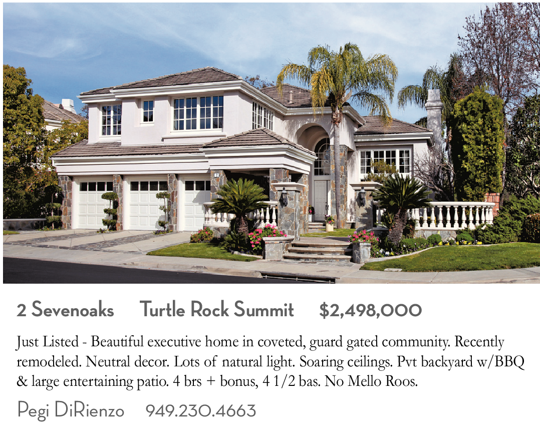 2 Sevenoaks Turtle Rock Summit $2,498,000 Just Listed - Beautiful executive home in coveted, guard gated community. Recently remodeled. Neutral decor. Lots of natural light. Soaring ceilings. Pvt backyard w/BBQ & large entertaining patio. 4 brs + bonus, 4 1/2 bas. No Mello Roos. Pegi DiRienzo 949.230.4663