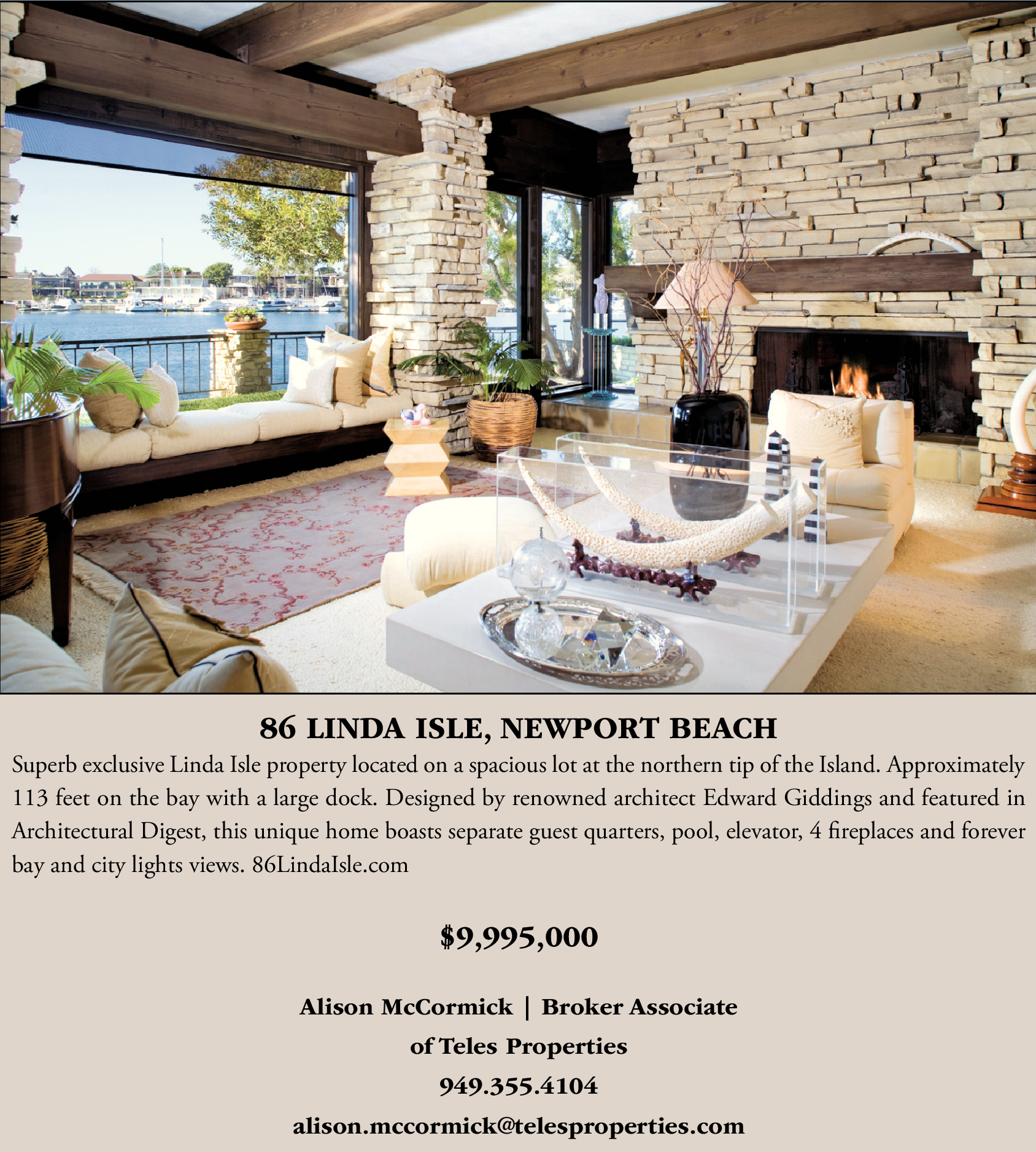 86 LINDA ISLE, NEWPORT BEACH Superb exclusive Linda Isle property located on a spacious lot at the northern tip of the Island. Approximately 113 feet on the bay with a large dock. Designed by renowned architect Edward Giddings and featured in Architectural Digest, this unique home boasts separate guest quarters, pool, elevator, 4 fireplaces and forever bay and city lights views. 86LindaIsle.com $9,995,000 Alison McCormick | Broker Associate of Teles Properties 949.355.4104 alison.mccormick@telesproperties.com