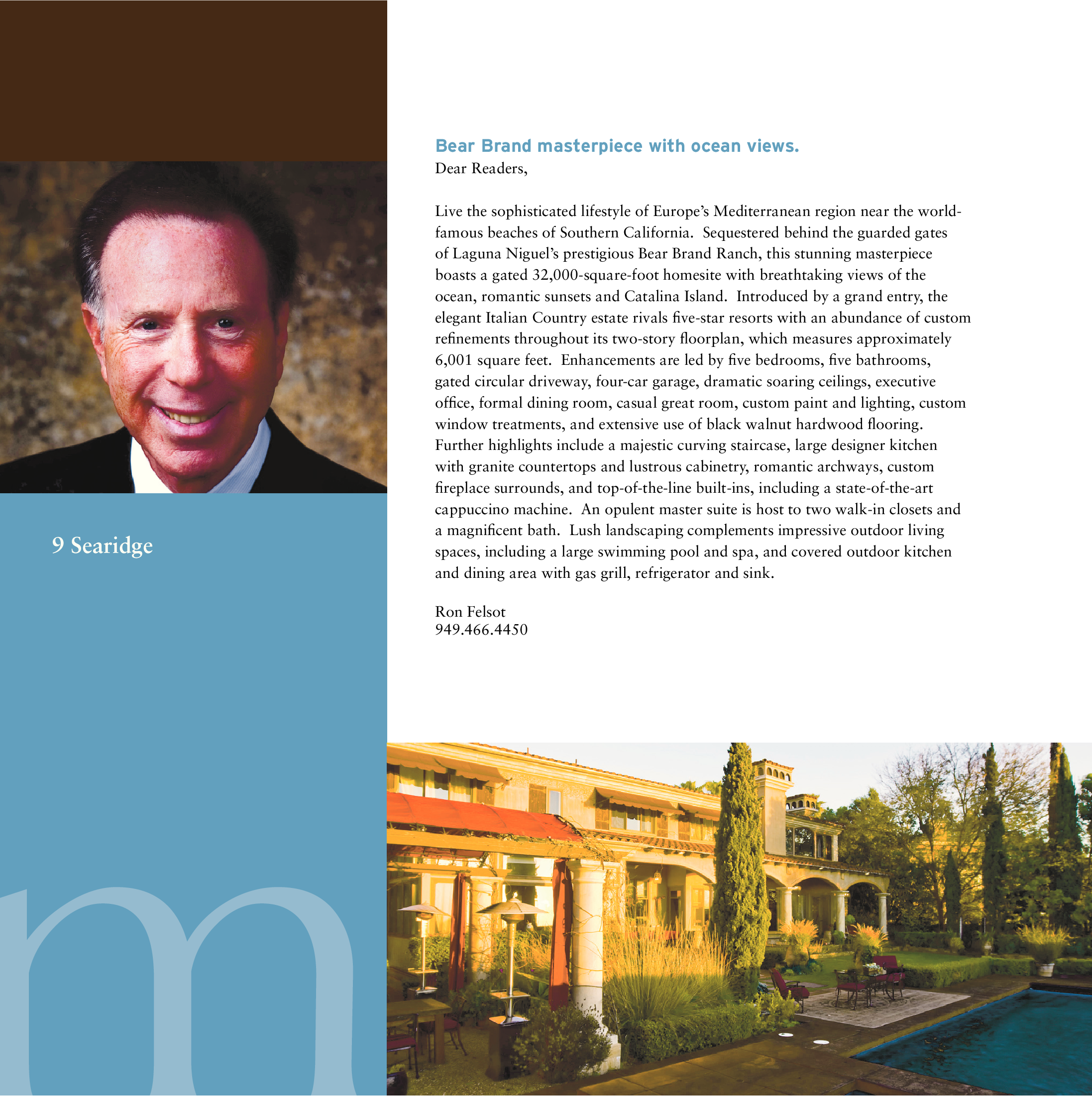 Live the sophisticated lifestyle of Europe’s Mediterranean region near the worldfamous beaches of Southern California. Sequestered behind the guarded gates of Laguna Niguel’s prestigious Bear Brand Ranch, this stunning masterpiece boasts a gated 32,000-square-foot homesite with breathtaking views of the ocean, romantic sunsets and Catalina Island. Introduced by a grand entry, the elegant Italian Country estate rivals five-star resorts with an abundance of custom refinements throughout its two-story floorplan, which measures approximately 6,001 square feet. Enhancements are led by five bedrooms, five bathrooms, gated circular driveway, four-car garage, dramatic soaring ceilings, executive office, formal dining room, casual great room, custom paint and lighting, custom window treatments, and extensive use of black walnut hardwood flooring. Further highlights include a majestic curving staircase, large designer kitchen with granite countertops and lustrous cabinetry, romantic archways, custom fireplace surrounds, and top-of-the-line built-ins, including a state-of-the-art cappuccino machine. An opulent master suite is host to two walk-in closets and a magnificent bath. Lush landscaping complements impressive outdoor living spaces, including a large swimming pool and spa, and covered outdoor kitchen and dining area with gas grill, refrigerator and sink.