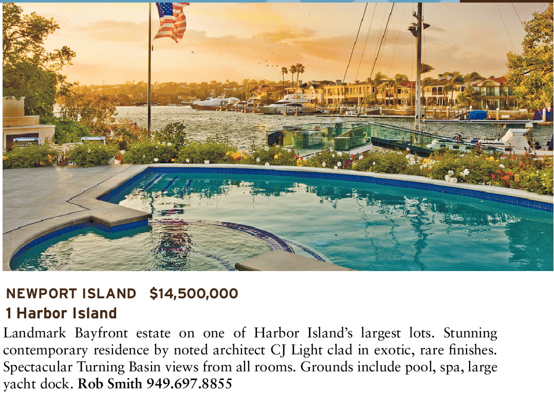 NEWPORT ISLAND $14,500,000 1 Harbor Island Landmark Bayfront estate on one of Harbor Island’s largest lots. Stunning contemporary residence by noted architect CJ Light clad in exotic, rare finishes. Spectacular Turning Basin views from all rooms. Grounds include pool, spa, large yacht dock. Rob Smith 949.697.8855