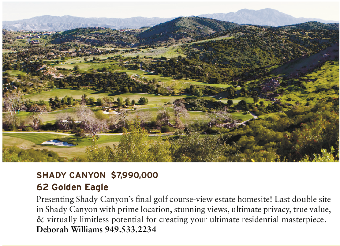 SHADY CANYON $7,990,000 62 Golden Eagle Presenting Shady Canyon’s final golf course-view estate homesite! Last double site in Shady Canyon with prime location, stunning views, ultimate privacy, true value, & virtually limitless potential for creating your ultimate residential masterpiece. Deborah Williams 949.533.2234