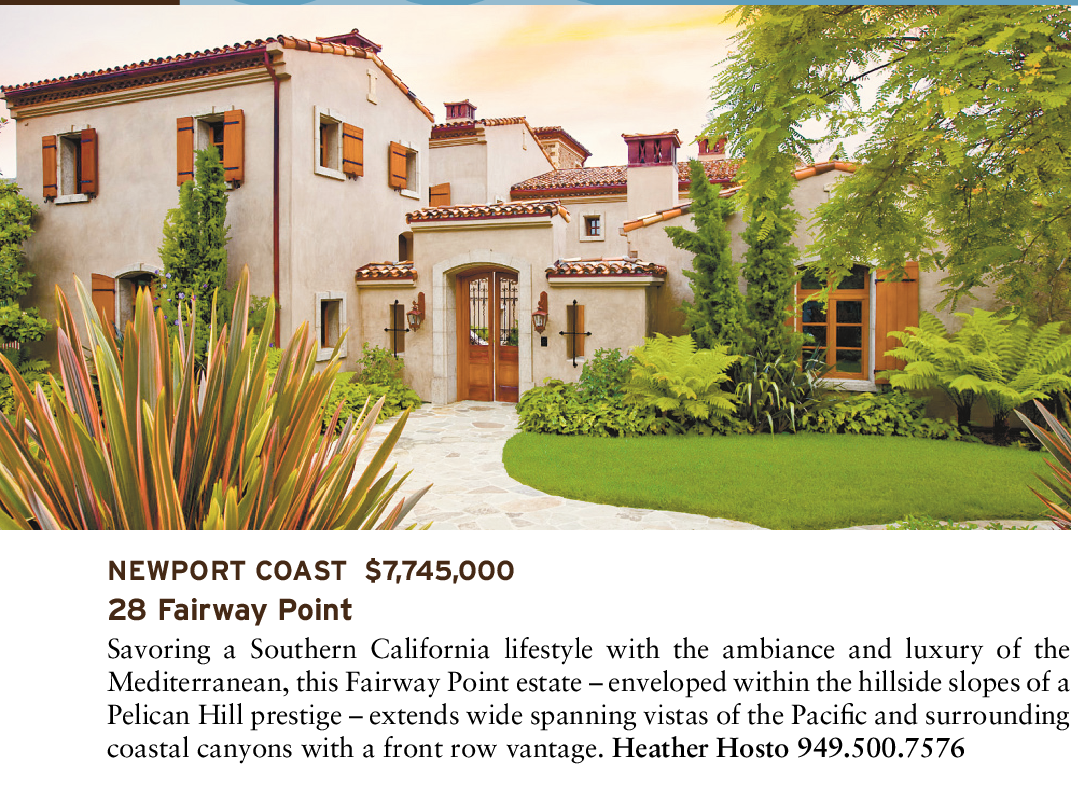 NEWPORT COAST $7,745,000 28 Fairway Point Savoring a Southern California lifestyle with the ambiance and luxury of the Mediterranean, this Fairway Point estate – enveloped within the hillside slopes of a Pelican Hill prestige – extends wide spanning vistas of the Pacific and surrounding coastal canyons with a front row vantage. Heather Hosto 949.500.7576