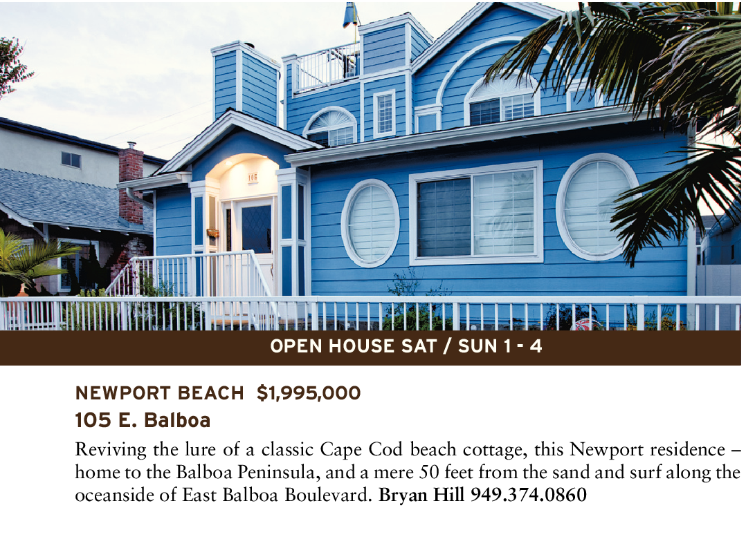 NEWPORT BEACH $1,995,000 105 E. Balboa OPEN HOUSE SAT / SUN 1 - 4 Reviving the lure of a classic Cape Cod beach cottage, this Newport residence – home to the Balboa Peninsula, and a mere 50 feet from the sand and surf along the oceanside of East Balboa Boulevard. Bryan Hill 949.374.0860