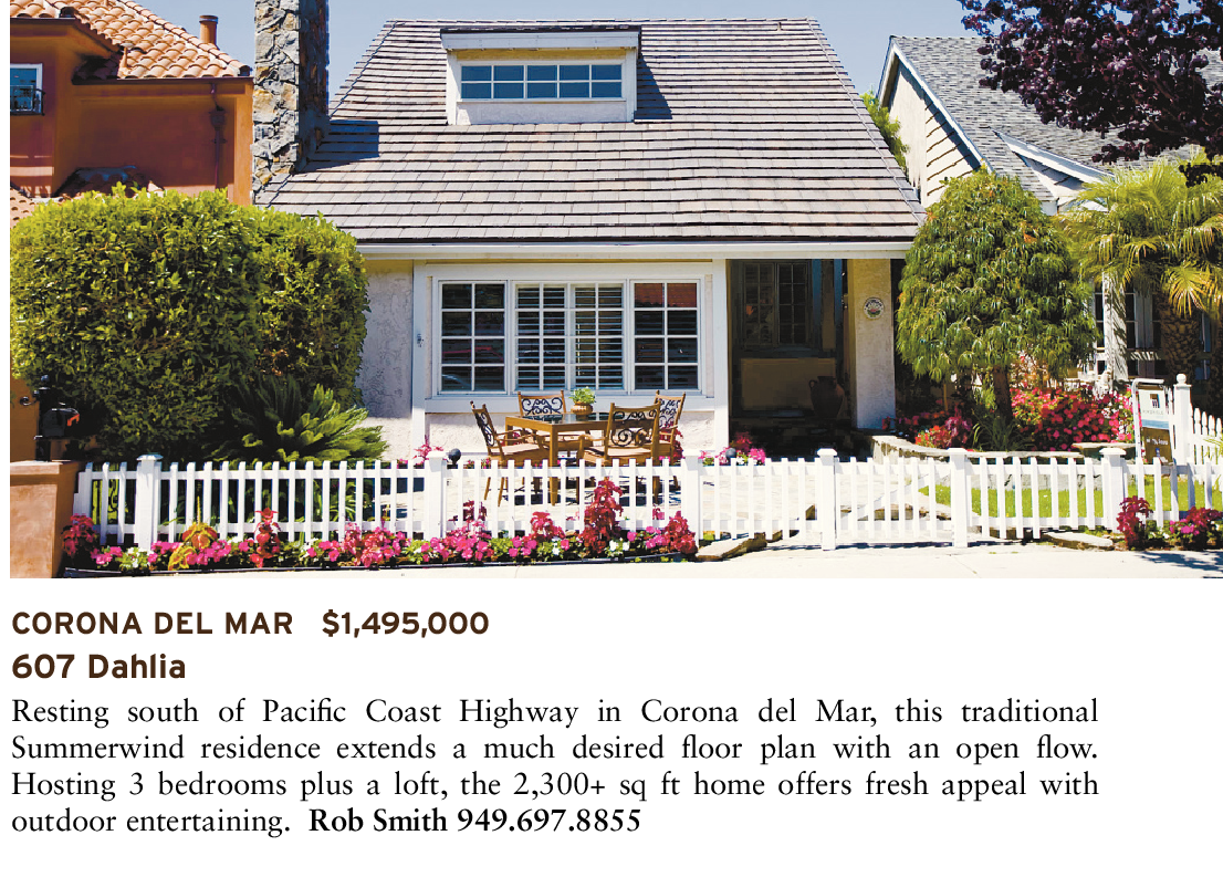 CORONA DEL MAR $1,495,000 607 Dahlia Resting south of Pacific Coast Highway in Corona del Mar, this traditional Summerwind residence extends a much desired floor plan with an open flow. Hosting 3 bedrooms plus a loft, the 2,300+ sq ft home offers fresh appeal with outdoor entertaining. Rob Smith 949.697.8855