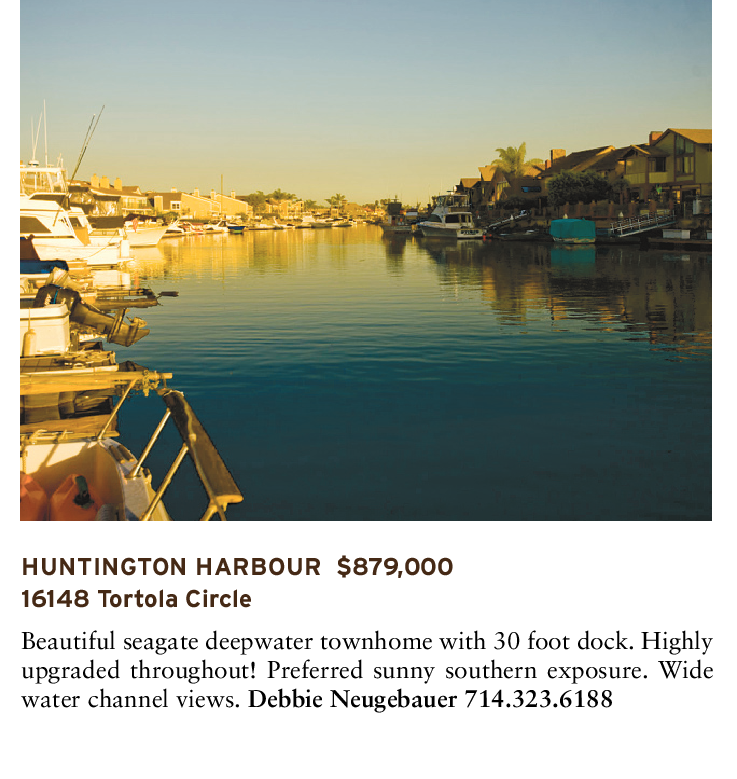 HUNTINGTON HARBOUR $879,000 16148 Tortola Circle Beautiful seagate deepwater townhome with 30 foot dock. Highly upgraded throughout! Preferred sunny southern exposure. Wide water channel views. Debbie Neugebauer 714.323.6188