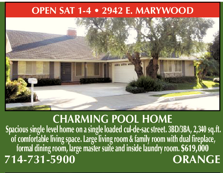 of comfortable living space. Large living room & family room with dual fireplace, formal dining room, large master suite and inside laundry room. $619,000 714-731-5900 ORANGE