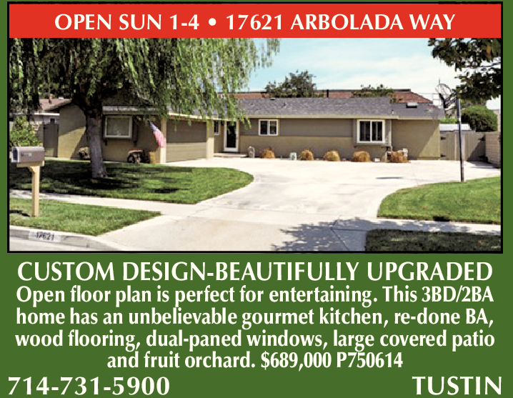 OPEN SUN 1-4 • 17621 ARBOLADA WAY CUSTOM DESIGN-BEAUTIFULLY UPGRADED Open floor plan is perfect for entertaining. This 3BD/2BA home has an unbelievable gourmet kitchen, re-done BA, wood flooring, dual-paned windows, large covered patio and fruit orchard. $689,000 P750614 714-731-5900 TUSTIN