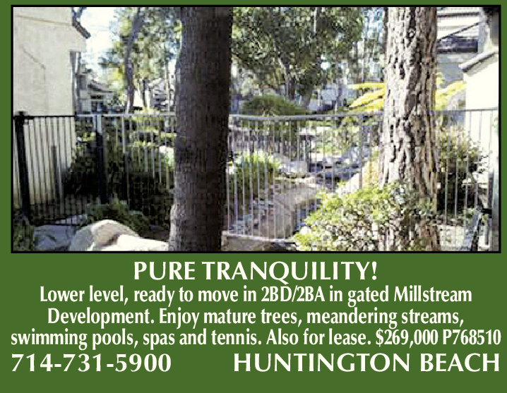 Lower level, ready to move in 2BD/2BA in gated Millstream Development. Enjoy mature trees, meandering streams, swimming pools, spas and tennis. Also for lease. $269,000 P768510 714-731-5900 HUNTINGTON BEACH