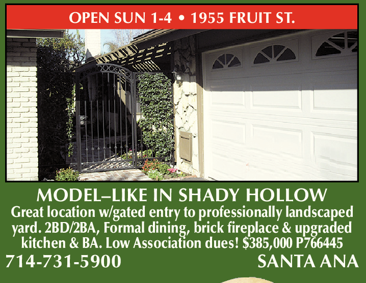 MODEL–LIKE IN SHADY HOLLOW Great location w/gated entry to professionally landscaped yard. 2BD/2BA, Formal dining, brick fireplace & upgraded kitchen & BA. Low Association dues! $385,000 P766445 714-731-5900 SANTA ANA