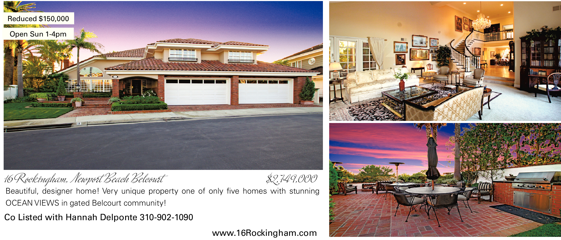 Reduced $150,000 Open Sun 1-4pm 16 Rockingham, Newport Beach Belcourt $2,749,000 Beautiful, designer home! Very unique property one of only five homes with stunning OCEAN VIEWS in gated Belcourt community! Co Listed with Hannah Delponte 310-902-1090 www.16Rockingham.com