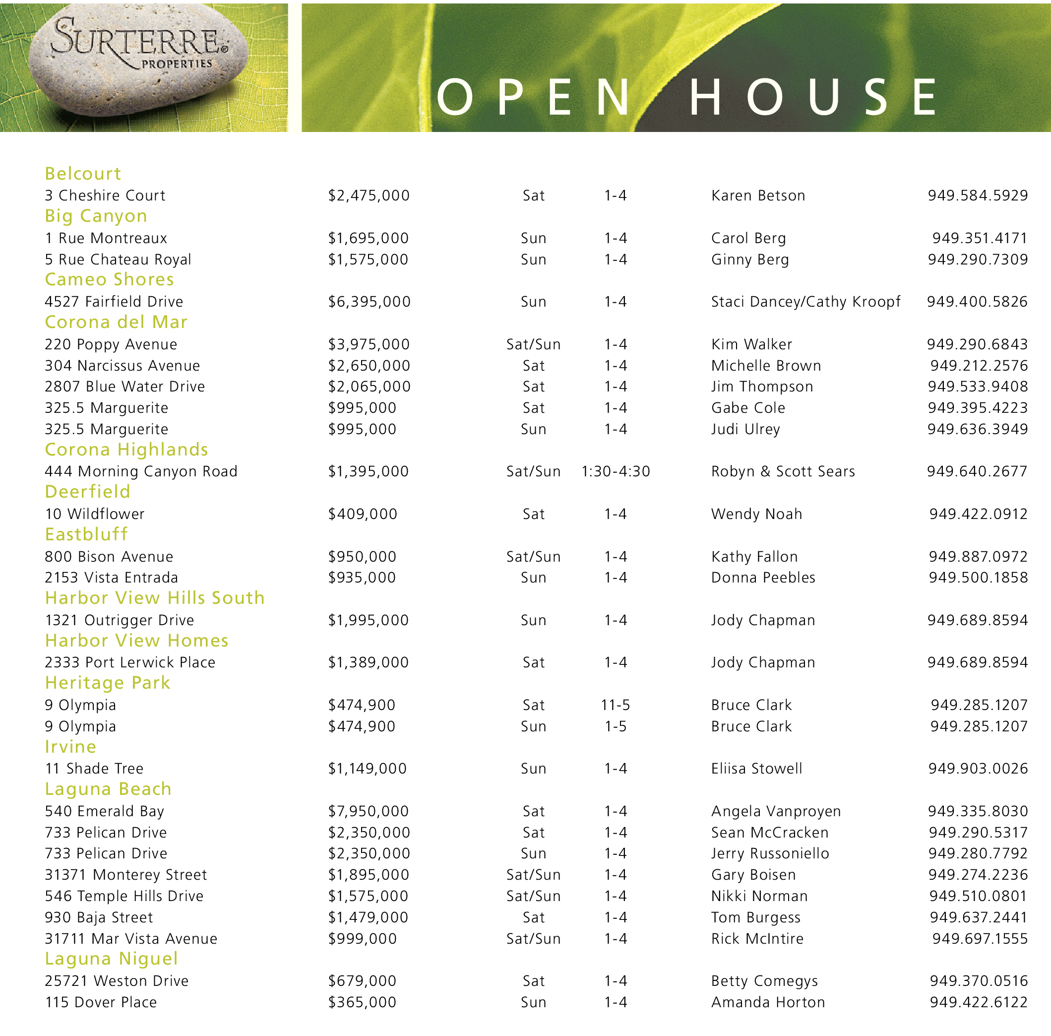 Belcourt 3 Cheshire Court $2,475,000 Sat 1-4 Karen Betson 949.584.5929 Big Canyon 1 Rue Montreaux $1,695,000 Sun 1-4 Carol Berg 949.351.4171 5 Rue Chateau Royal $1,575,000 Sun 1-4 Ginny Berg 949.290.7309 Cameo Shores 4527 Fairfield Drive $6,395,000 Sun 1-4 Staci Dancey/Cathy Kroopf 949.400.5826 Corona del Mar 220 Poppy Avenue $3,975,000 Sat/Sun 1-4 Kim Walker 949.290.6843 304 Narcissus Avenue $2,650,000 Sat 1-4 Michelle Brown 949.212.2576 2807 Blue Water Drive $2,065,000 Sat 1-4 Jim Thompson 949.533.9408 325.5 Marguerite $995,000 Sat 1-4 Gabe Cole 949.395.4223 325.5 Marguerite $995,000 Sun 1-4 Judi Ulrey 949.636.3949 Corona Highlands 444 Morning Canyon Road $1,395,000 Sat/Sun 1:30-4:30 Robyn & Scott Sears 949.640.2677 Deerfield 10 Wildflower $409,000 Sat 1-4 Wendy Noah 949.422.0912 Eastbluff 800 Bison Avenue $950,000 Sat/Sun 1-4 Kathy Fallon 949.887.0972 2153 Vista Entrada $935,000 Sun 1-4 Donna Peebles 949.500.1858 Harbor View Hills South 1321 Outrigger Drive $1,995,000 Sun 1-4 Jody Chapman 949.689.8594 Harbor View Homes 2333 Port Lerwick Place $1,389,000 Sat 1-4 Jody Chapman 949.689.8594 Heritage Park 9 Olympia $474,900 Sat 11-5 Bruce Clark 949.285.1207 9 Olympia $474,900 Sun 1-5 Bruce Clark 949.285.1207 Irvine 11 Shade Tree $1,149,000 Sun 1-4 Eliisa Stowell 949.903.0026 Laguna Beach 540 Emerald Bay $7,950,000 Sat 1-4 Angela Vanproyen 949.335.8030 733 Pelican Drive $2,350,000 Sat 1-4 Sean McCracken 949.290.5317 733 Pelican Drive $2,350,000 Sun 1-4 Jerry Russoniello 949.280.7792 31371 Monterey Street $1,895,000 Sat/Sun 1-4 Gary Boisen 949.274.2236 546 Temple Hills Drive $1,575,000 Sat/Sun 1-4 Nikki Norman 949.510.0801 930 Baja Street $1,479,000 Sat 1-4 Tom Burgess 949.637.2441 31711 Mar Vista Avenue $999,000 Sat/Sun 1-4 Rick McIntire 949.697.1555 Laguna Niguel 25721 Weston Drive $679,000 Sat 1-4 Betty Comegys 949.370.0516 115 Dover Place $365,000 Sun 1-4 Amanda Horton 949.422.6122