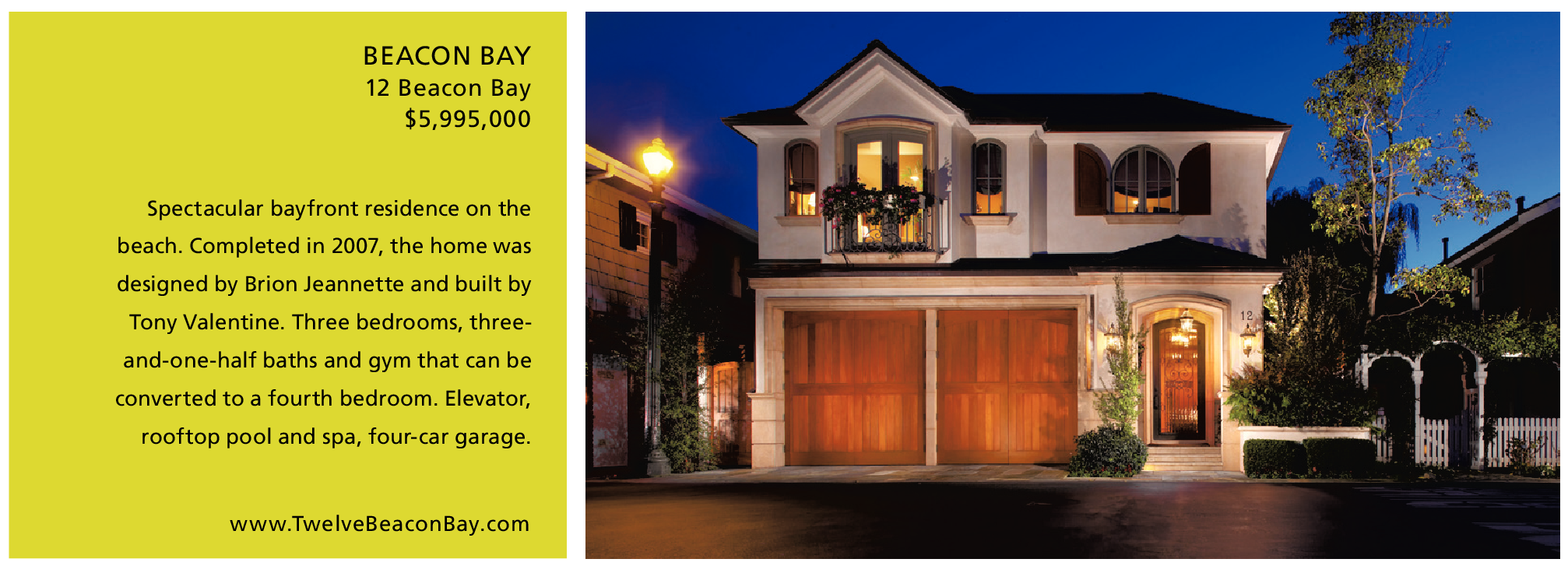 Spectacular bayfront residence on the beach. Completed in 2007, the home was designed by Brion Jeannette and built by Tony Valentine. Three bedrooms, threeand-one-half baths and gym that can be converted to a fourth bedroom. Elevator, rooftop pool and spa, four-car garage. www.TwelveBeaconBay.com BEACON BAY 12 Beacon Bay $5,995,000