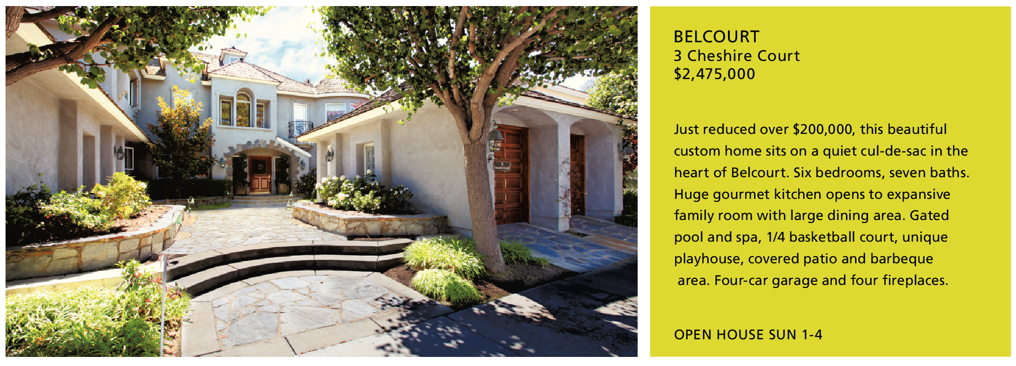 BELCOURT 3 Cheshire Court $2,475,000 Just reduced over $200,000, this beautiful custom home sits on a quiet cul-de-sac in the heart of Belcourt. Six bedrooms, seven baths. Huge gourmet kitchen opens to expansive family room with large dining area. Gated pool and spa, 1/4 basketball court, unique playhouse, covered patio and barbeque area. Four-car garage and four fireplaces. OPEN HOUSE SUN 1-4