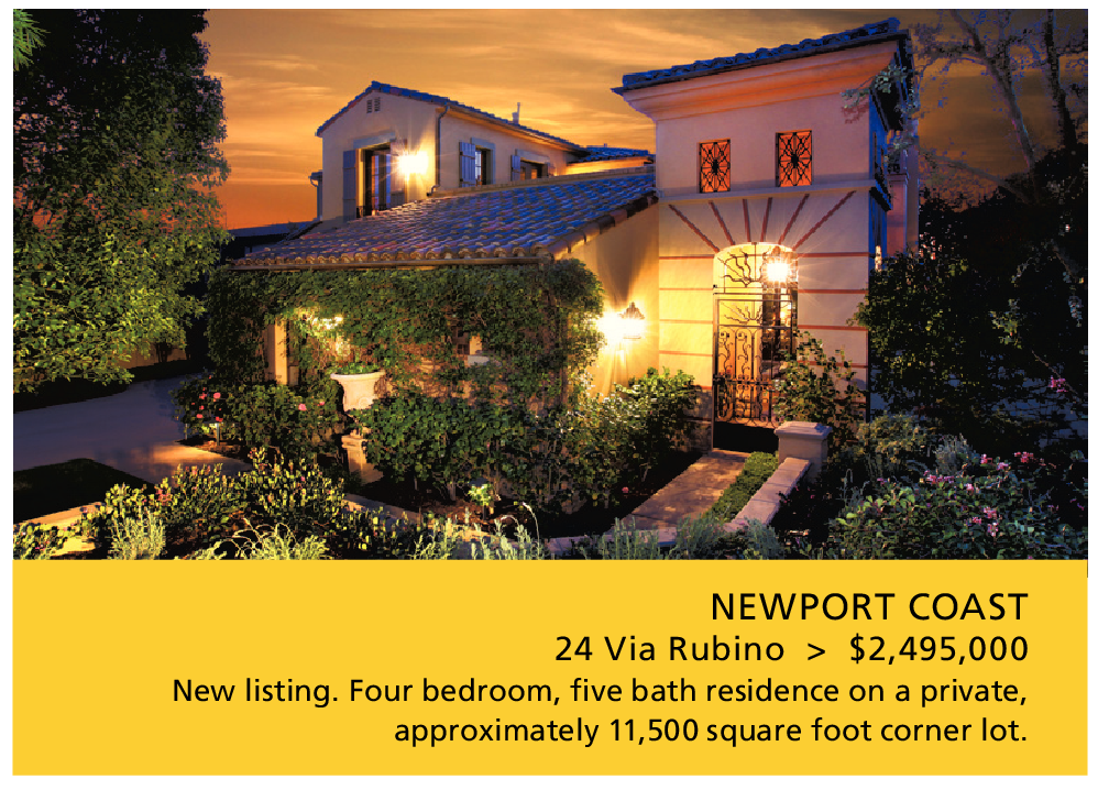 NEWPORT COAST 24 Via Rubino > $2,495,000 New listing. Four bedroom, five bath residence on a private, approximately 11,500 square foot corner lot.