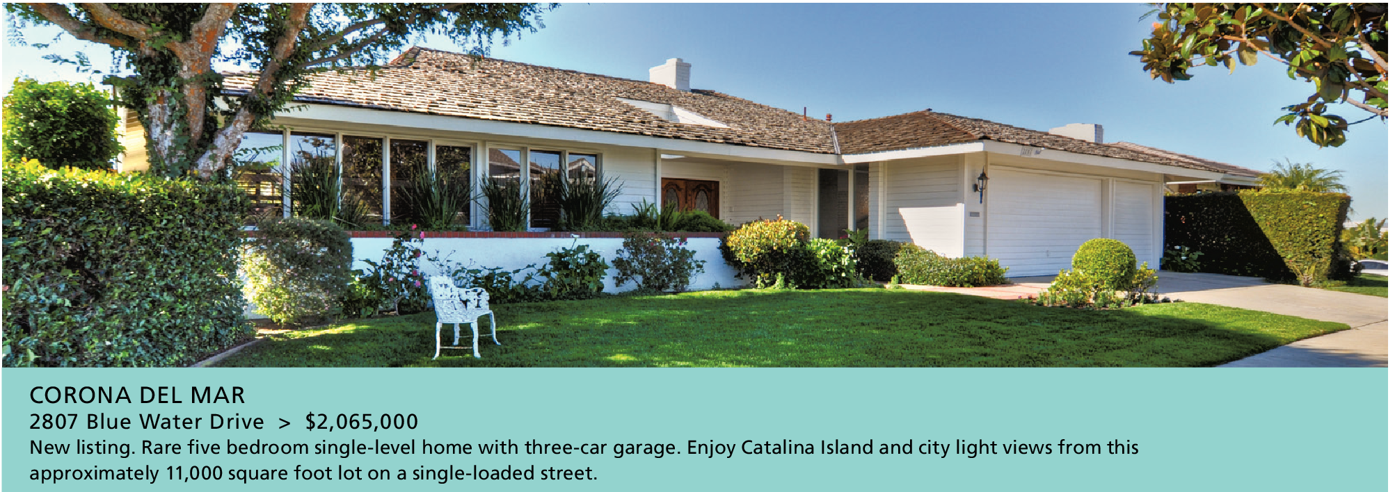 CORONA DEL MAR 2807 Blue Water Drive > $2,065,000 New listing. Rare five bedroom single-level home with three-car garage. Enjoy Catalina Island and city light views from this approximately 11,000 square foot lot on a single-loaded street.