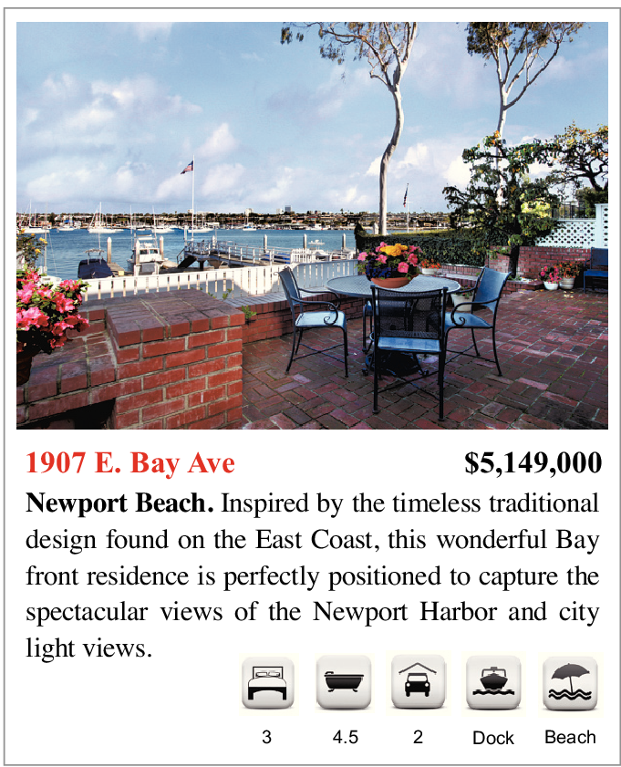 1907 E. Bay Ave $5,149,000 Newport Beach. Inspired by the timeless traditional design found on the East Coast, this wonderful Bay front residence is perfectly positioned to capture the spectacular views of the Newport Harbor and city light views.