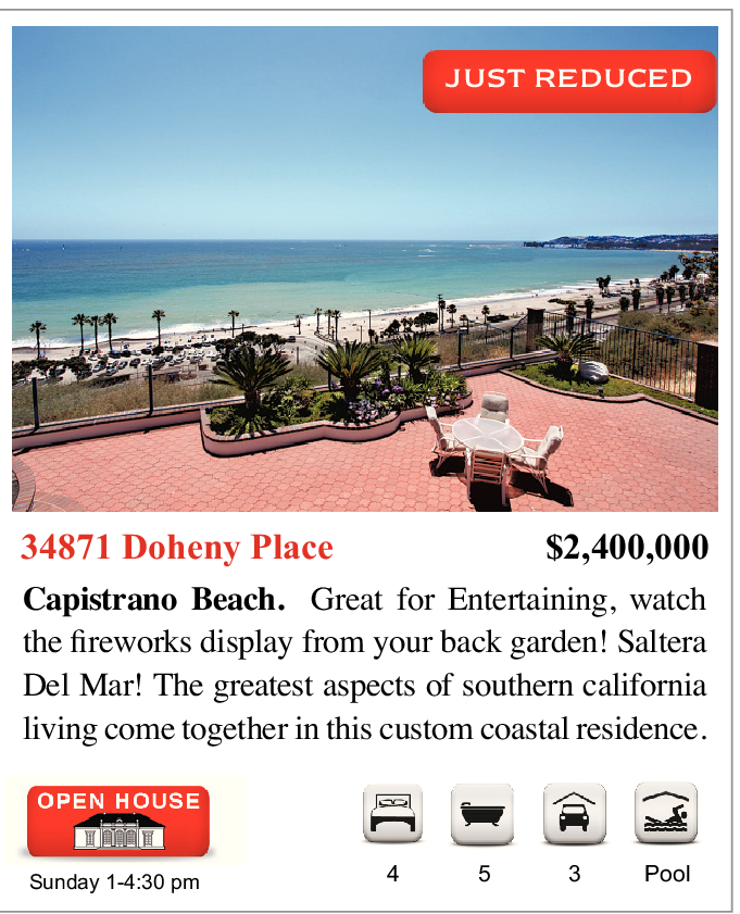 JUST REDUCED 34871 Doheny Place $2,400,000 Capistrano Beach. Great for Entertaining, watch the fireworks display from your back garden! Saltera Del Mar! The greatest aspects of southern california living come together in this custom coastal residence. Sunday 1-4:30 pm 4 5 3 Pool See also