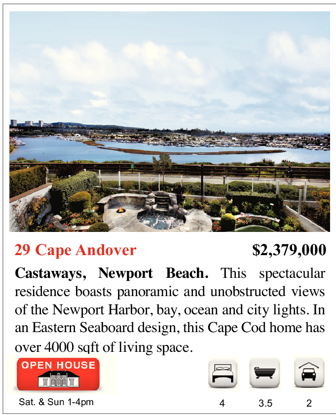 29 Cape Andover $2,379,000 Castaways, Newport Beach. This spectacular residence boasts panoramic and unobstructed views of the Newport Harbor, bay, ocean and city lights. In an Eastern Seaboard design, this Cape Cod home has over 4000 sqft of living space. 4 3.5 2 Sat. & Sun 1-4pm