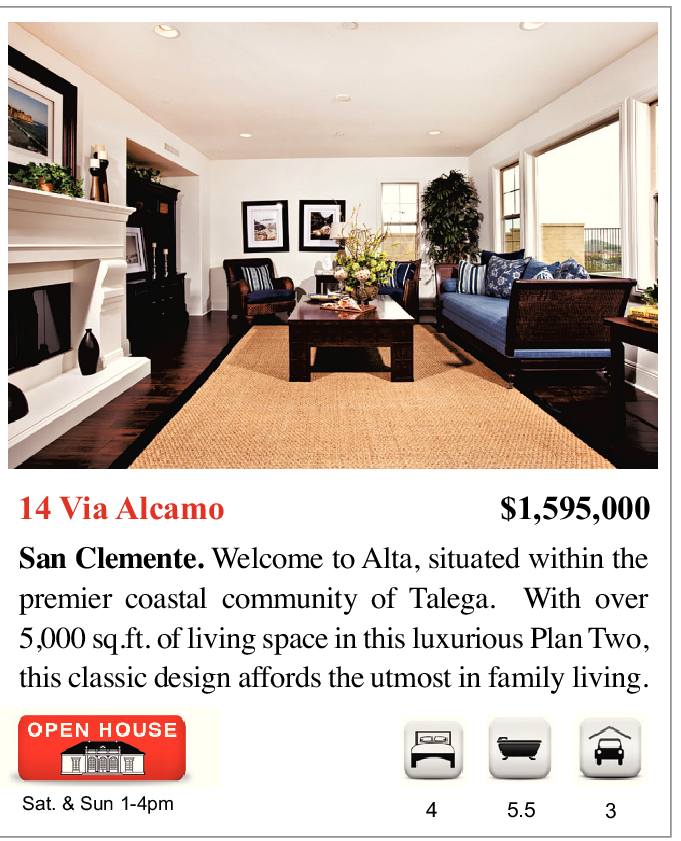 14 Via Alcamo $1,595,000 San Clemente. Welcome to Alta, situated within the premier coastal community of Talega. With over 5,000 sq.ft. of living space in this luxurious Plan Two, this classic design affords the utmost in family living. Sat. & Sun 1-4pm 4 5.5 3