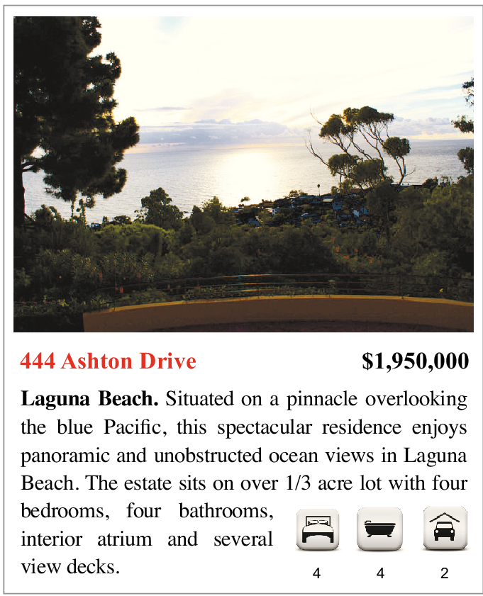 Laguna Beach. Situated on a pinnacle overlooking the blue Pacific, this spectacular residence enjoys panoramic and unobstructed ocean views in Laguna Beach. The estate sits on over 1/3 acre lot with four bedrooms, four bathrooms, interior atrium and several view decks.