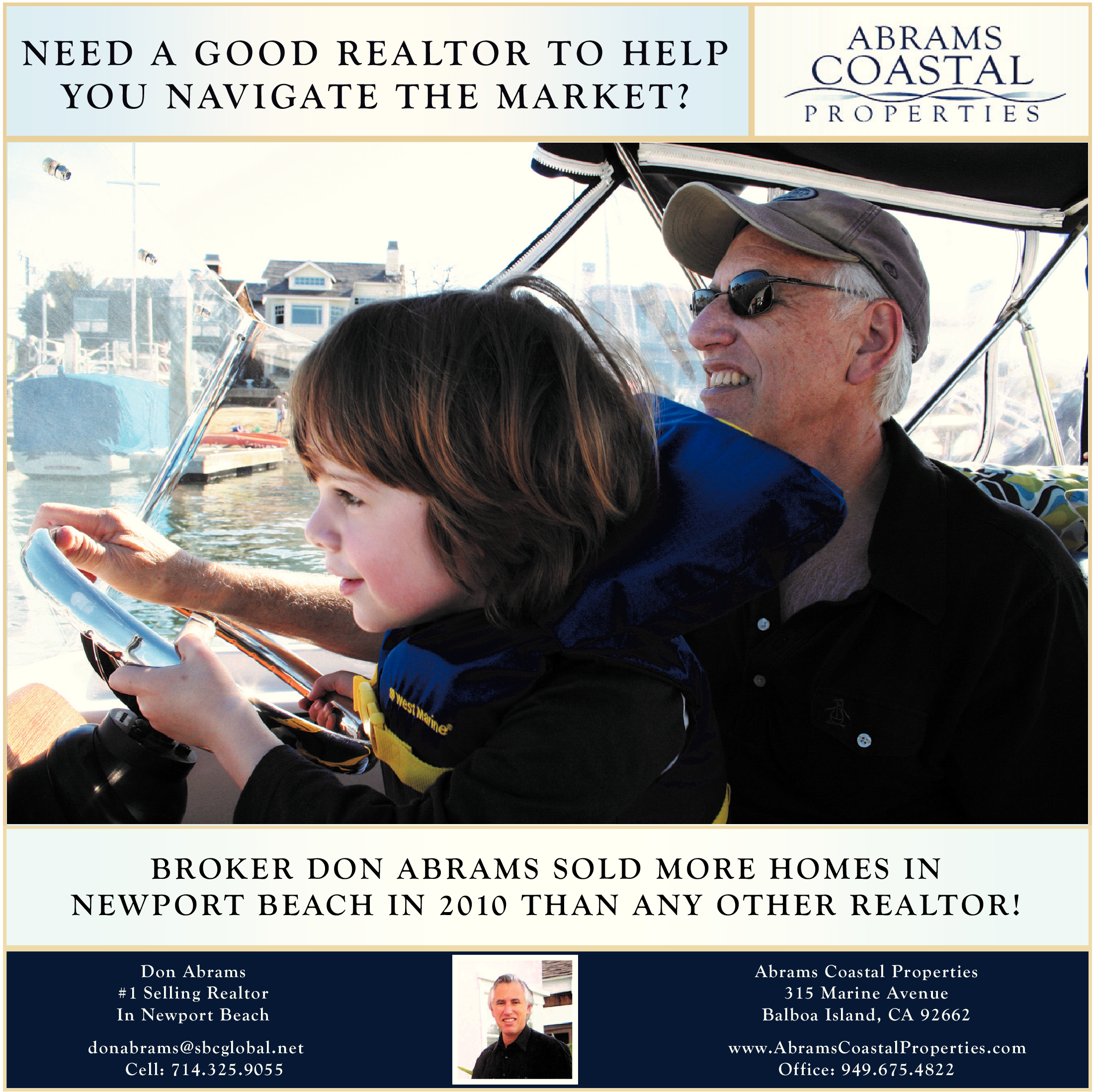 N E E D A G O O D R E A LT O R T O H E L P YO U N AV I G A T E T H E M A R K E T ? B RO K E R D O N A B R A M S S O L D M O R E H O M E S I N N E W P O RT B E AC H I N 2 010 T H A N A N Y O T H E R R E A LT O R ! Don Abrams #1 Selling Realtor In Newport Beach donabrams@sbcglobal.net Cell: 714.325.9055 Abrams Coastal Properties 315 Marine Avenue Balboa Island, CA 92662 www.AbramsCoastalProperties.com Office: 949.675.4822