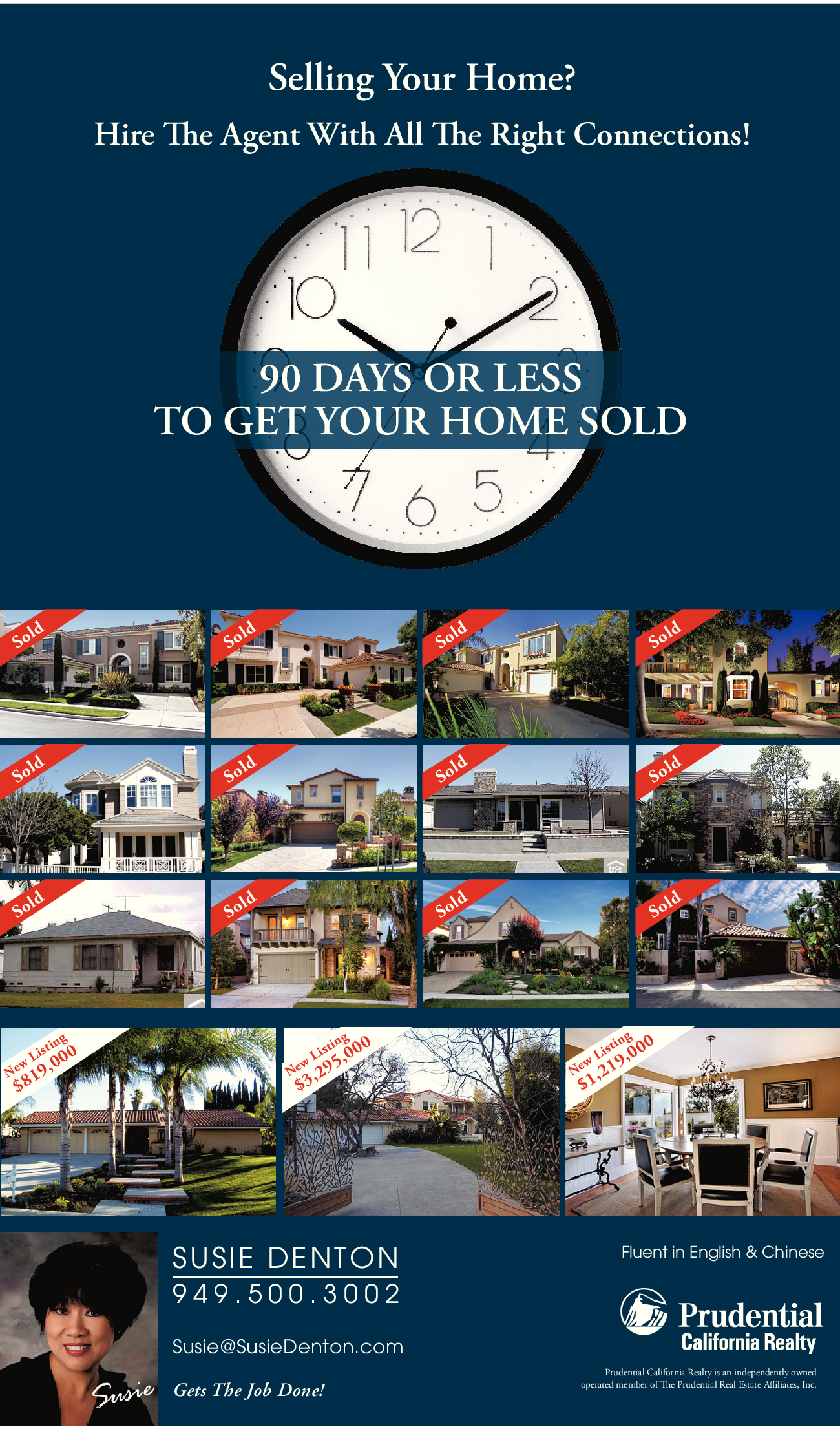 Selling Your Home? Hire The Agent With All The Right Connections! 90 DAYS OR LESS TO GET YOUR HOME SOLD SUSIE DENTON 9 4 9 . 5 0 0 . 3 0 0 2 Susie@SusieDenton.com Gets The Job Done! Fluent in English & Chinese Prudential California Realty is an independently owned operated member of The Prudential Real Estate Affiliates, Inc.