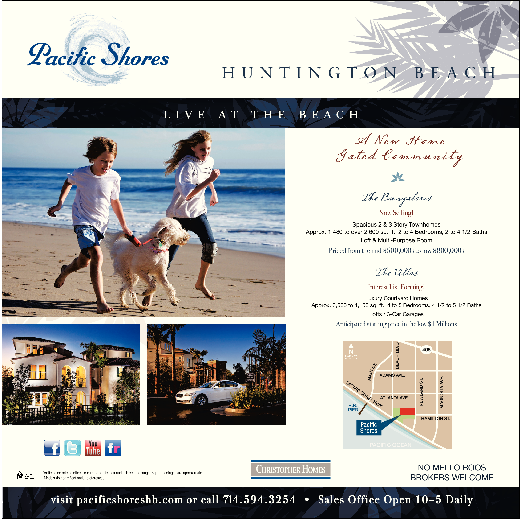 * Anticipated pricing effective date of publication and subject to change. Square footages are approximate. Models do not reflect racial preferences. H U N T I N G T O N B E A C H l i v e a t t h e b e a c h A New Home Gated Community The Bungalows Now Selling! Spacious 2 & 3 Story Townhomes Approx. 1,480 to over 2,600 sq. ft., 2 to 4 Bedrooms, 2 to 4 1/2 Baths Loft & Multi-Purpose Room Priced from the mid $500,000s to low $800,000s The Villas Interest List Forming! Luxury Courtyard Homes Approx. 3,500 to 4,100 sq. ft., 4 to 5 Bedrooms, 4 1/2 to 5 1/2 Baths Lofts / 3-Car Garages Anticipated starting price in the low $1 Millions NO MELLO ROOS BROKERS WELCOME visit pacificshoreshb.com or call 714.594.3254 • Sales Office Open 10–5 Daily N MAP NOT TO SCALE H.B. PIER Pacific Shores ADAMS AVE. ATLANTA AVE. PACIFIC OCEAN 405 HAMILTON ST.