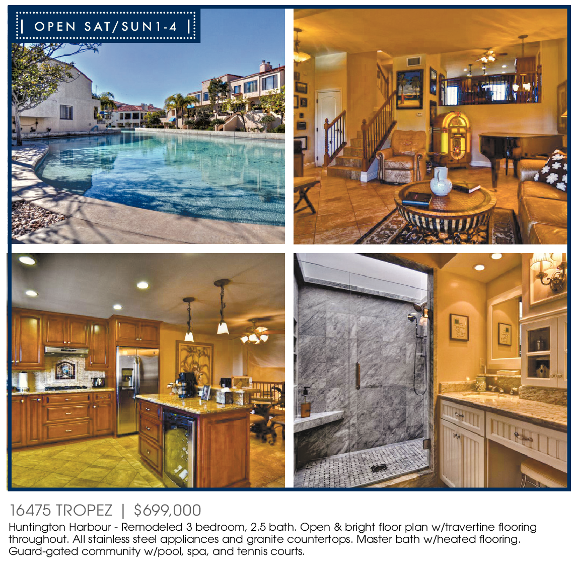 16475 TROPEZ | $699,000 Huntington Harbour - Remodeled 3 bedroom, 2.5 bath. Open & bright floor plan w/travertine flooring throughout. All stainless steel appliances and granite countertops. Master bath w/heated flooring. Guard-gated community w/pool, spa, and tennis courts. | OPEN SAT/SUN1-4 |
